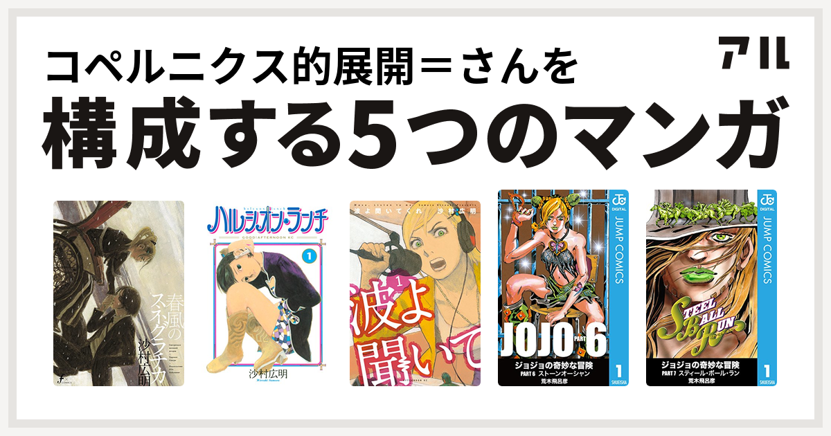 コペルニクス的展開 さんを構成するマンガは春風のスネグラチカ ハルシオン ランチ 波よ聞いてくれ ジョジョの奇妙な冒険 第6部 ジョジョの奇妙な冒険 第7部 私を構成する5つのマンガ アル